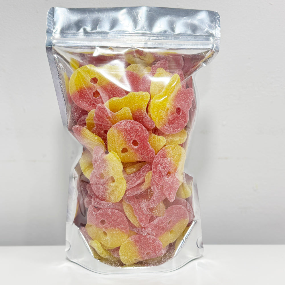 Sour fruit flavour jelly skulls. Suitable for vegans.