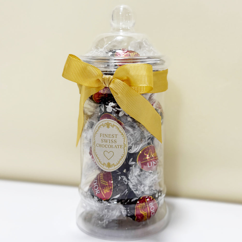 Delight in this charming Victorian-style jar filled with 15 Lindt Lindor Strawberry Dark Chocolate Truffles, imported from the USA. Adorned with a festive ribbon, it's perfect for gifting during Christmas or any special occasion. A new dark chocolate Lindt Lindor with a smooth fruity strawberry filling. These individually wrapped delights are the perfect size to enjoy anytime, anywhere. Beautifully presented in a keepsake jar that adds elegance and sweetness to any celebration. A treat worth savoring!